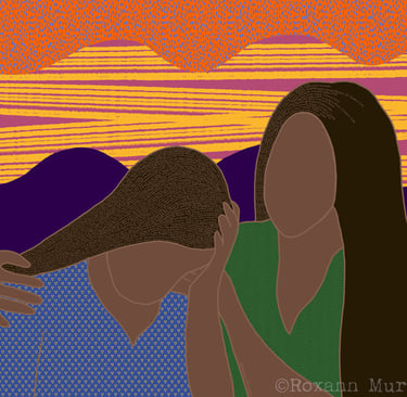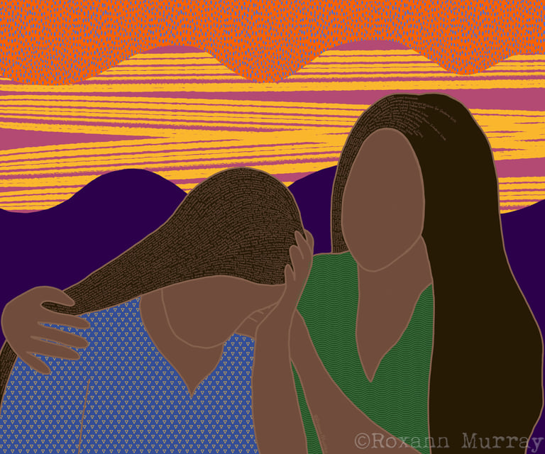 Boarding schools affect my DNA. My grandfather went to Fort Peck boarding school. My great-grandmother went to a boarding school. The words in the hair include all of the boarding schools in the U.S. The woman with her hair filled in with the names represents those of us who haven’t been able to heal yet. The woman on the right has less names in her hair because she has done a lot of healing and she can now help others with theirs. 73 of the boarding schools remain open as of 2020. 15 are still boarding. The majority of the schools were Catholic, Presbyterian, and Quaker. Information was provided by the National Native American Boarding School Healing Coalition.