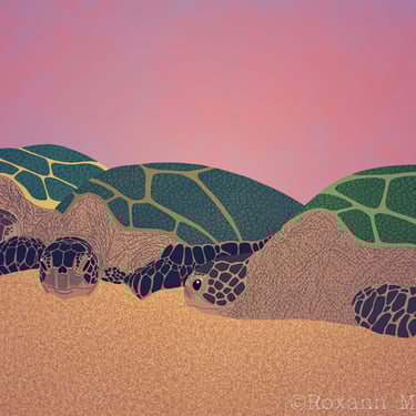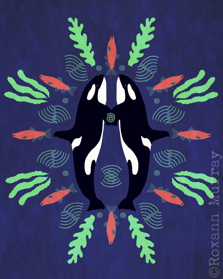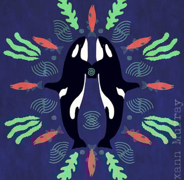 I created “Honoring Natural Cycles” as an homage to the orca salmon connection. The line designs surrounding the orcas represent sonar, which is how they find food and communicate. The spirals represent the life cycles of the salmon and the orca. My heart has been broken since I learned about the struggles of Southern Resident orcas, including starvation caused by overfishing, military sonar effects, and unnecessary dams on rivers. I hope one day they can have their home back with an unlimited food source and a sonar-free atmosphere.